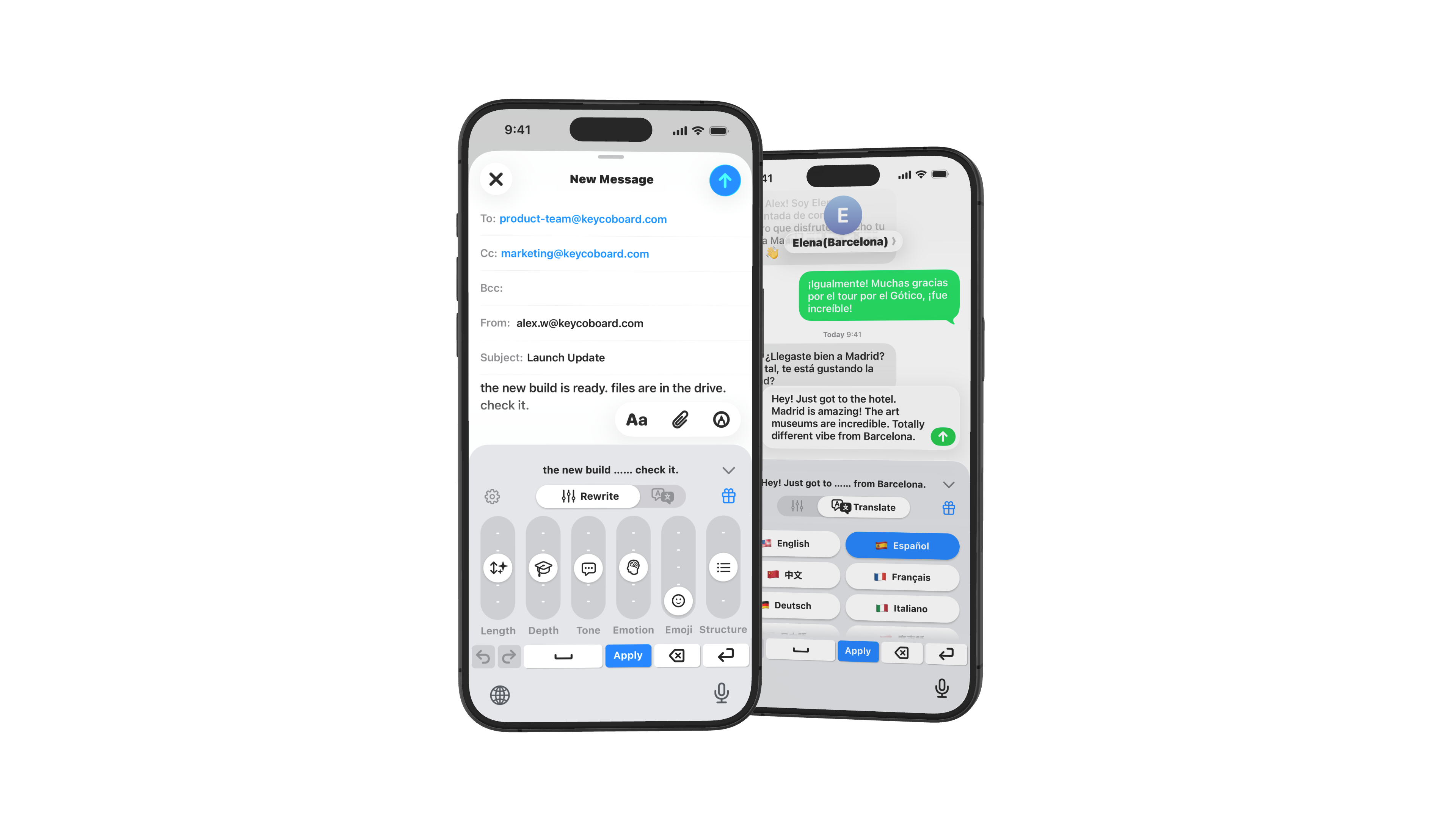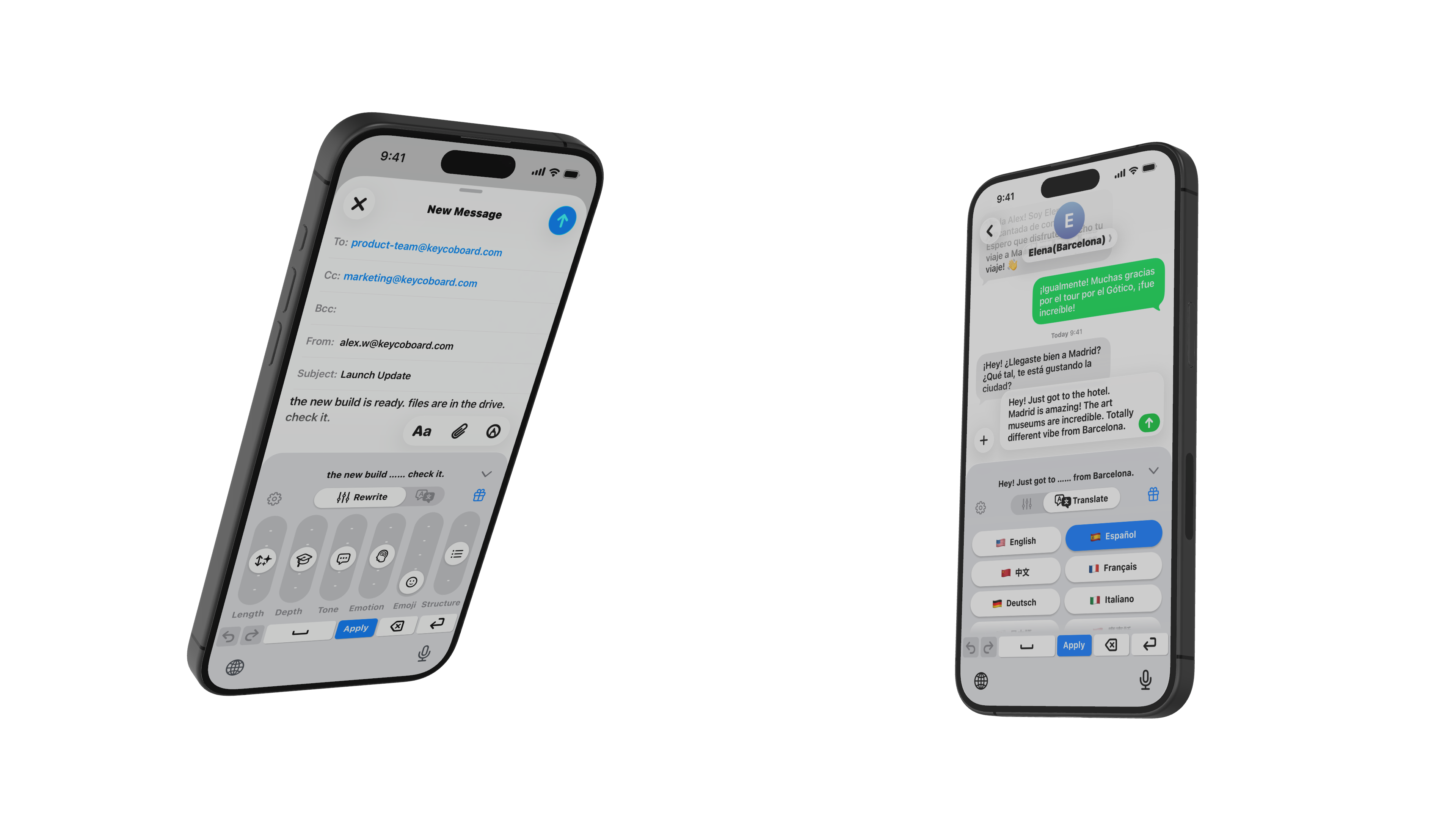 Slide to adjust tone, length, and style. Translate instantly. All inside your iOS keyboard.